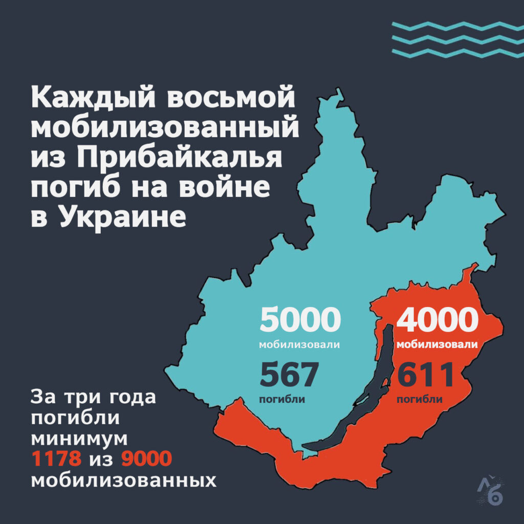 Сегодня в списке погибших военных из Прибайкалья, который ведут «Люди Байкала», чуть более 7000 имен. Из них 1178 — это мобилизованные: 567 из Иркутской области и 611 из Бурятии. То есть за три года погибло минимум 13% призванных на фронт осенью 2022 года. Среди иркутских мобилизованных погиб каждый девятый, среди бурятских — каждый седьмой.