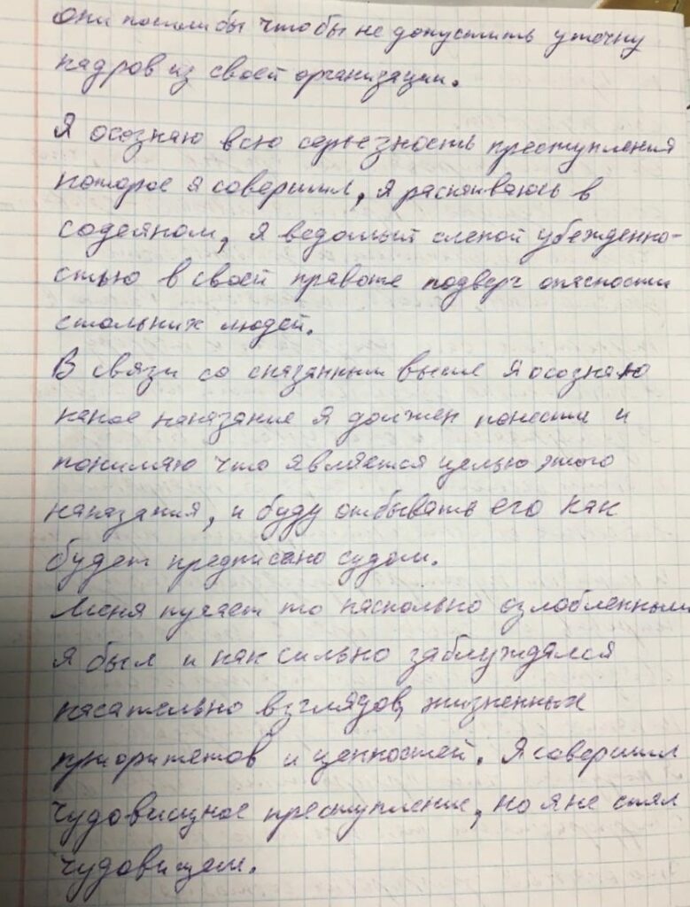 «Я уверен, что Россия победит и выстоит во всех трудностях, — написал в письме Семён. — Но как я смогу жить дальше, зная, что, по сути, был предателем? … В тюремной камере я подумал, в моей жизни прошлое не исправить, но сколько сейчас на воле таких же, каким был я? Сбившихся с правильного пути, попавших под иностранное влияние, как и я когда-то. Тех, кто, возможно, сейчас думает: „Совершить диверсию или нет?“ Всем вам кричу — однозначно — НЕТ! Посмотрите, что произошло со мной и откажитесь!»