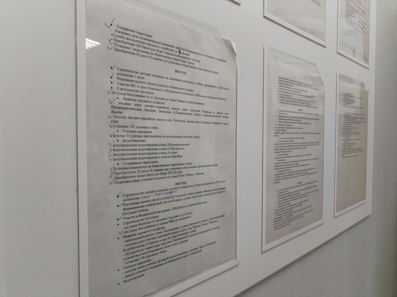 Свою предвыборную программу Щебляков повесил на стенде в администрации. Мэр и его команда зачеркивают выполненные обещания галочками. К 2025 году минимум половина галочек проставлена.
