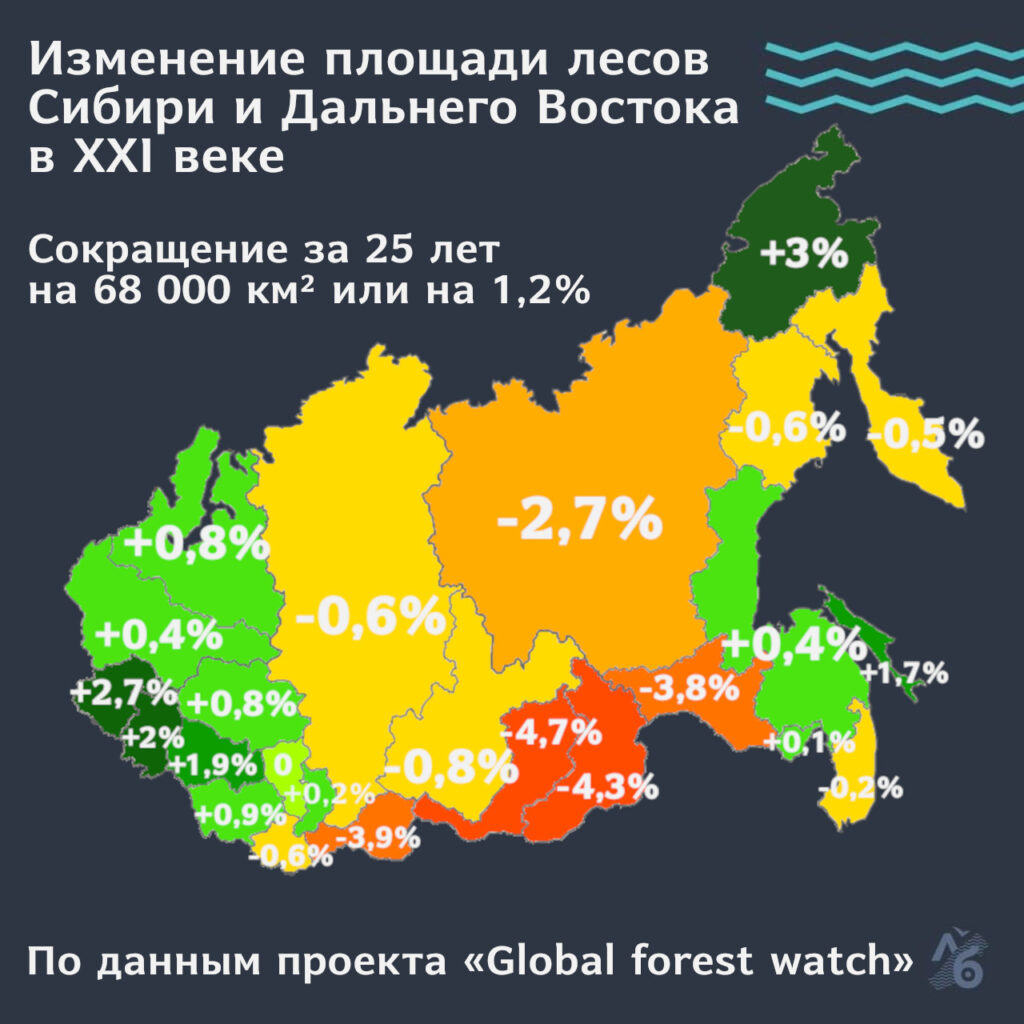 Анализ космоснимков показывает, что с 2000 года площадь лесов от Урала до Тихого океана сократилась на 1,2% или на 68 000 км². Это больше площади Литвы.