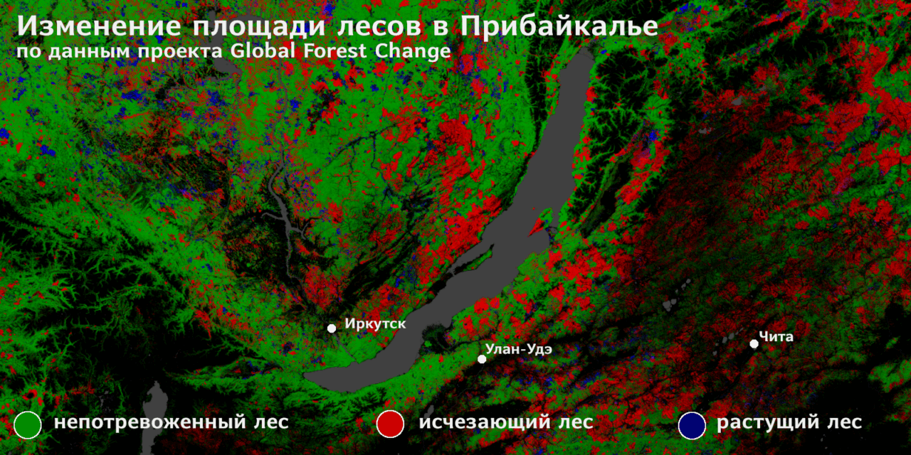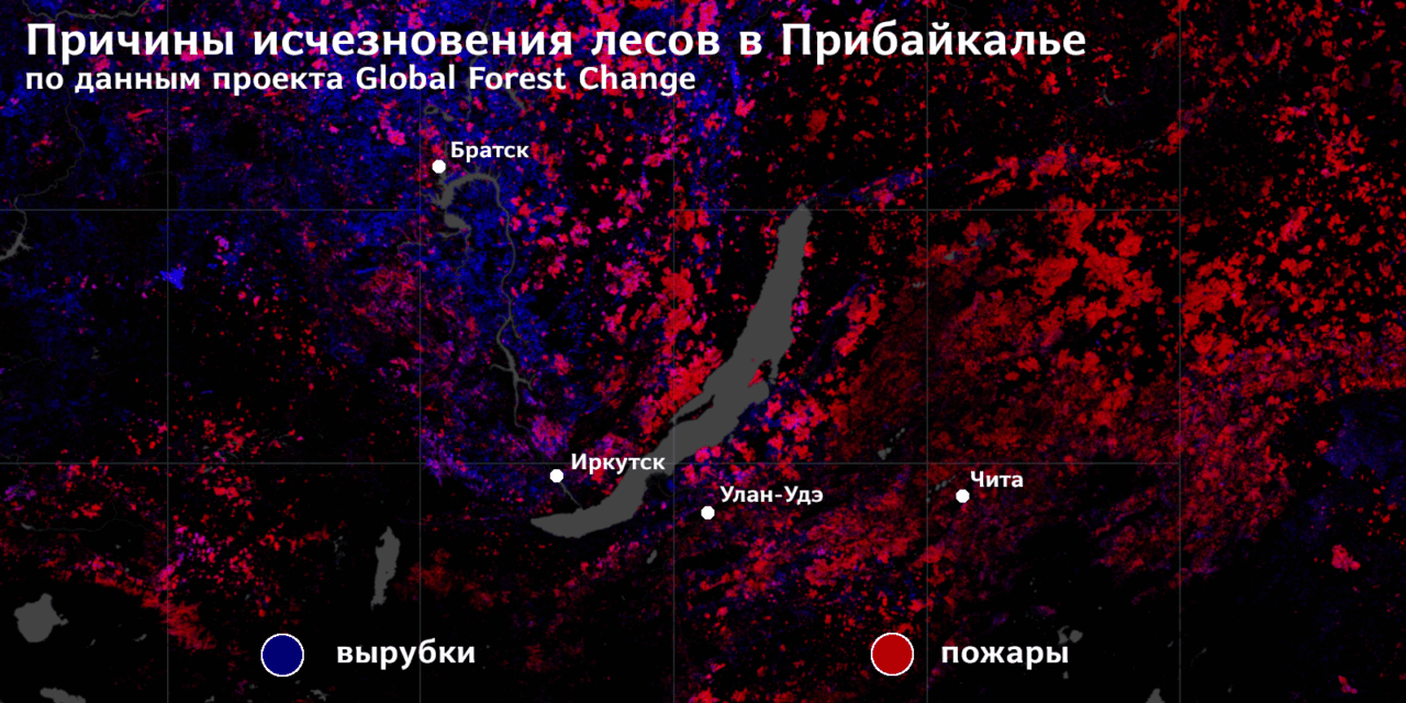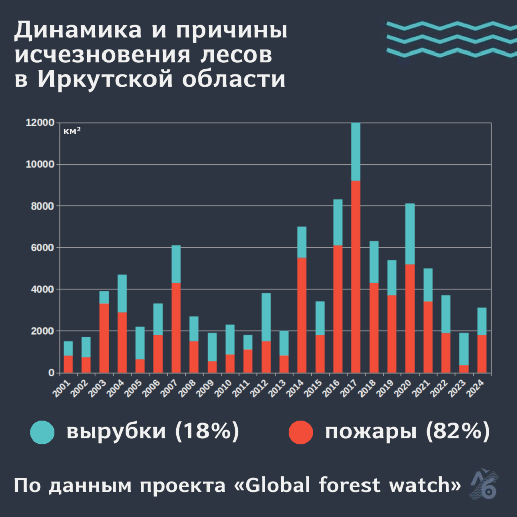 В Иркутской области леса сократились на 0,8% или 5 000 км² — это в два раза больше площади Москвы. Пожары стал причиной гибели 82% исчезнувших лесов, вырубки — 18%. Больше всех пострадали Катангский, Усть-Илимский, Киренский, Усть-Кутский и Качугский районы — в сумме они дали половину всех потерь области.