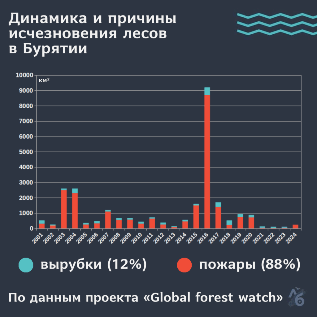 Бурятия понесла самые тяжелые потери в процентном отношении. За 25 лет леса здесь сократились на 4,7% или на 8 800 км² — это сопоставимо с площадью Кипра. Пожары стали причиной гибели в 88% случаев, а на вырубки пришлось 12%. Больше всех в Бурятии пострадали Баунтовский и Прибайкальский районы.