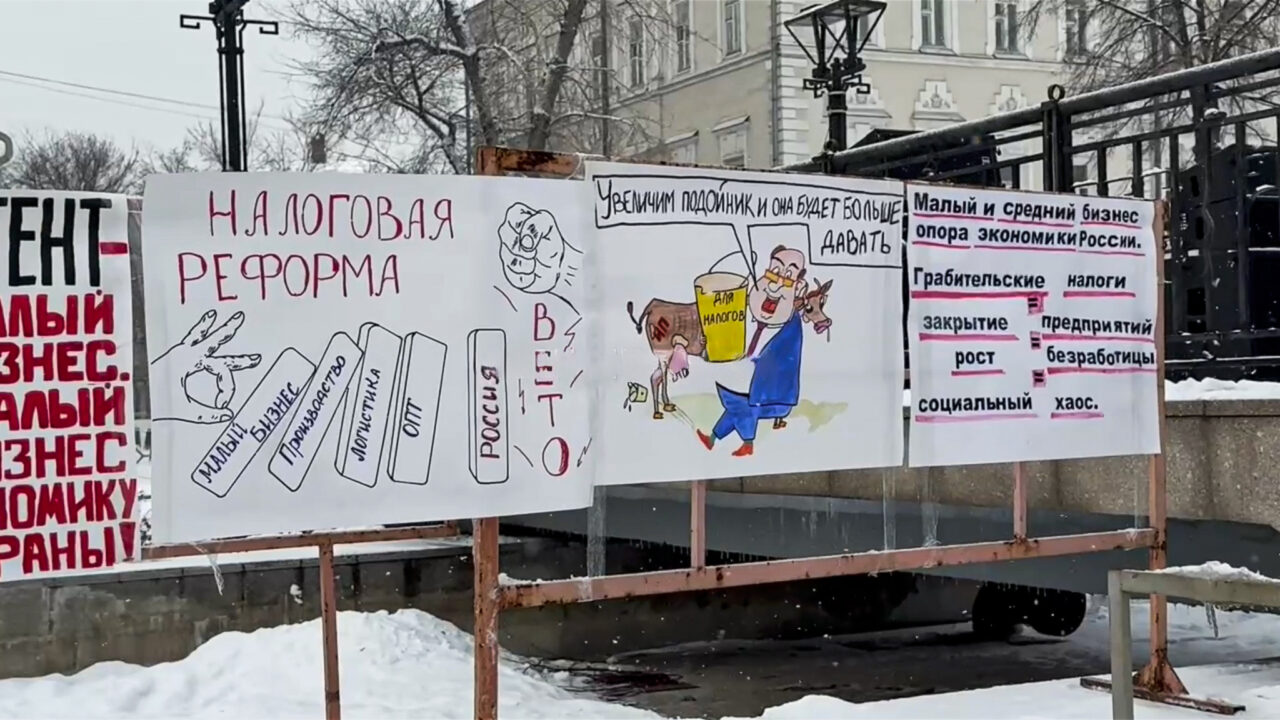 На занесенной снегом площади Труда у иркутского цирка почти 150 человек растягивают флаг России. Активисты поднимают плакаты с лозунгами: «Рост налогов = конец МСП = рост безработицы», «Мы за президента! Президент за нас!», «Отмените патент — уничтожите малый бизнес. Уничтожив малый бизнес, разрушите экономику страны».