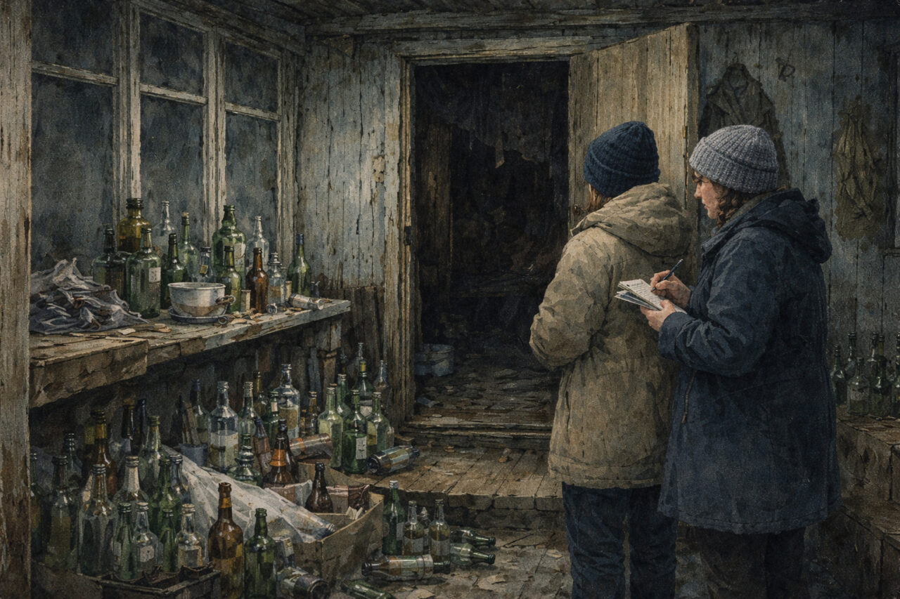 Частный дом, заходим на веранду, где все заставлено пустыми бутылками из-под алкоголя. Открываем дверь и сказать, что это бомжатник — ничего не сказать. Там нет отопления, воды, света. Есть несколько комнат, но жилая только одна. В этой комнате стоит старый потрепанный диван и мини-кушетка. Мама спит под овчинной шубой. Единственное тепло идет от включенной духовки.