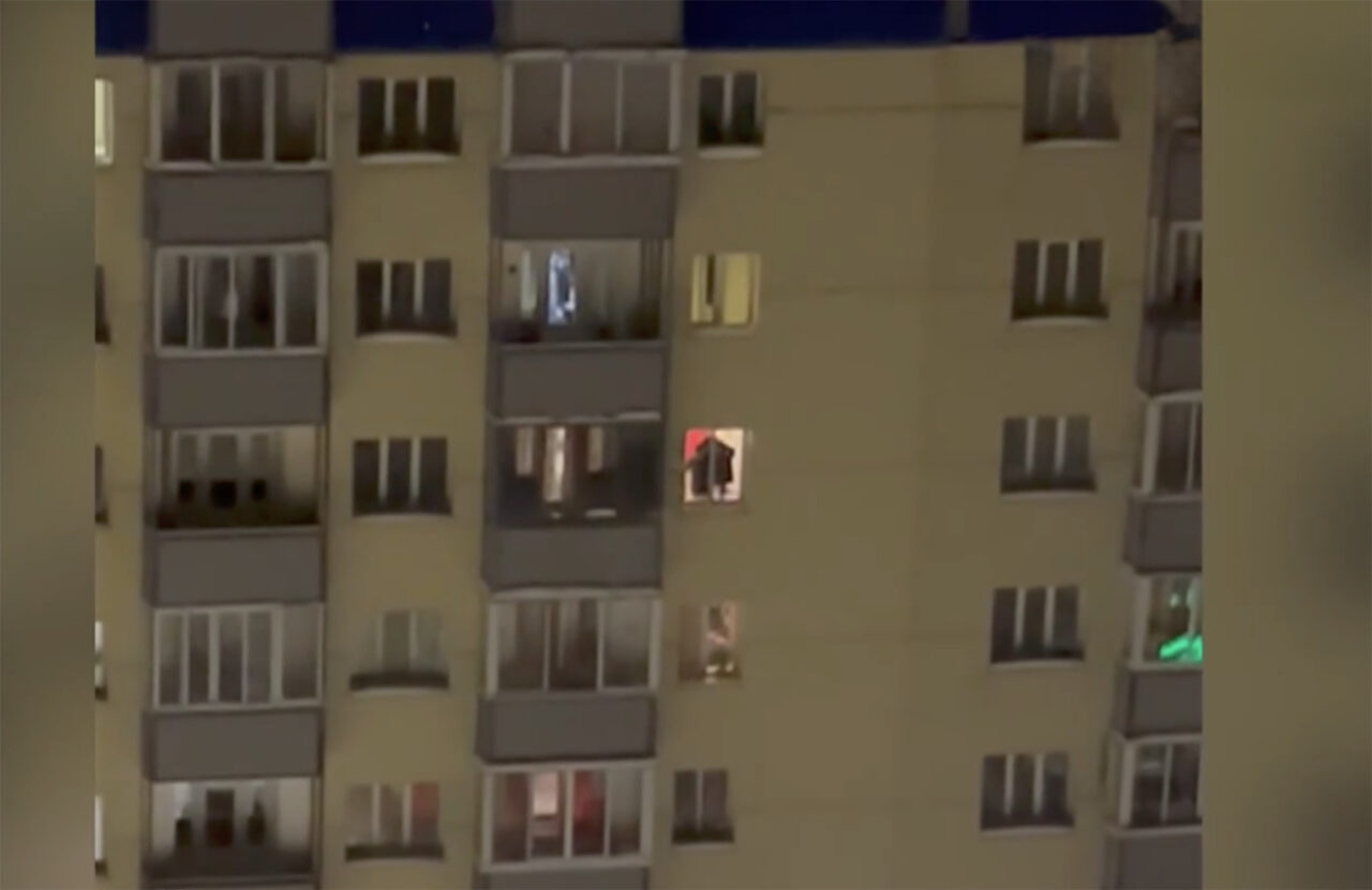 «Блядь, че делает, смотри», — произносит мужчина. «Ой, е-мае» — это уже женский голос. Пара снимает на видео соседний дом — в открытом настежь окне на пятом этаже, пошатываясь, стоит человек. Темный силуэт болтает ногой в воздухе, затем спрыгивает обратно в квартиру.