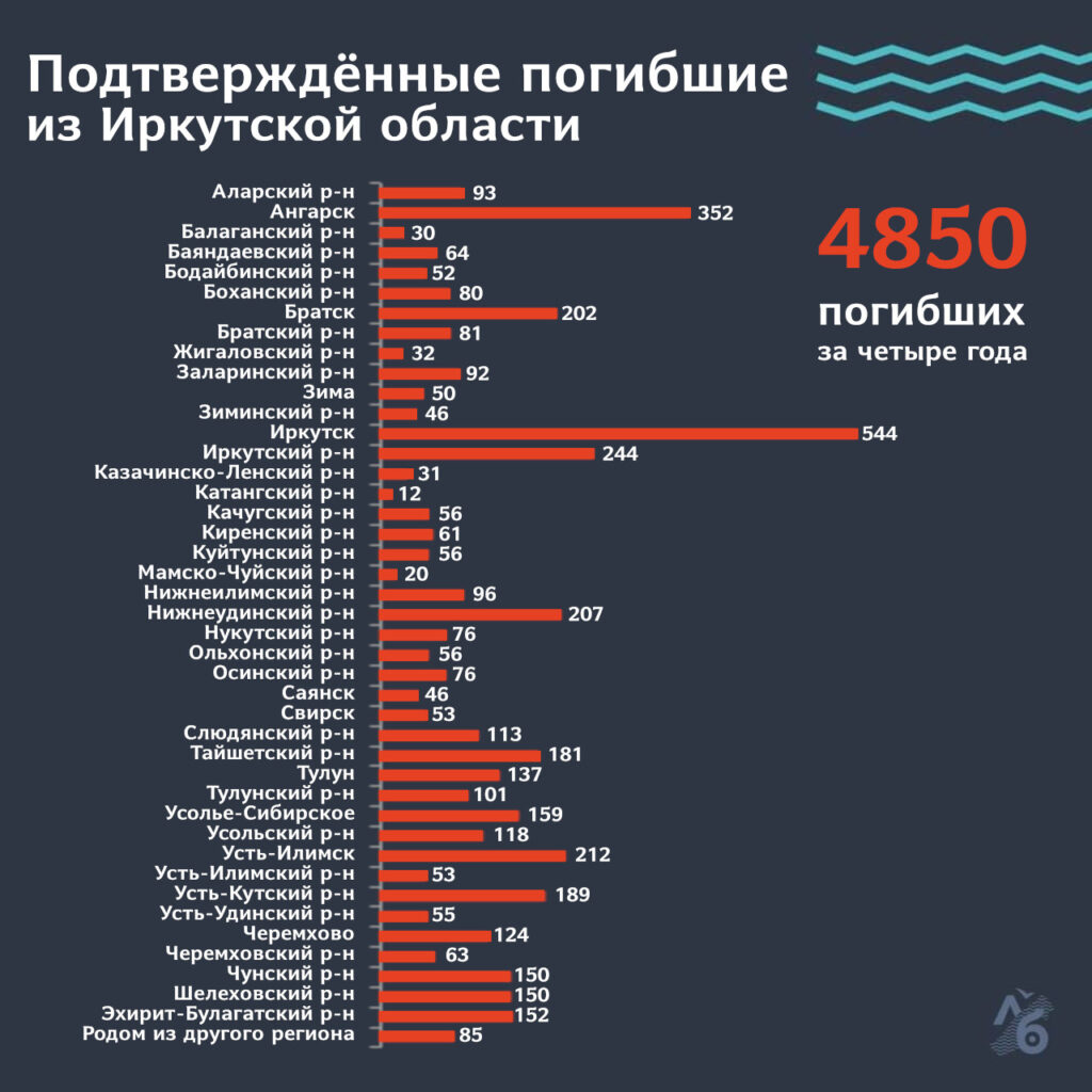 В «Списке погибших» мы собираем всю известную о человеке информацию, в том числе — место рождения. Бросается в глаза, что географически погибшие распределены по Прибайкалью очень неравномерно. По абсолютным цифрам потерь лидируют крупные города: Иркутск (544), Улан-Удэ (521) и Ангарск (352). Но по соотношению количества убитых к численности населения их значительно опережают сельские районы.