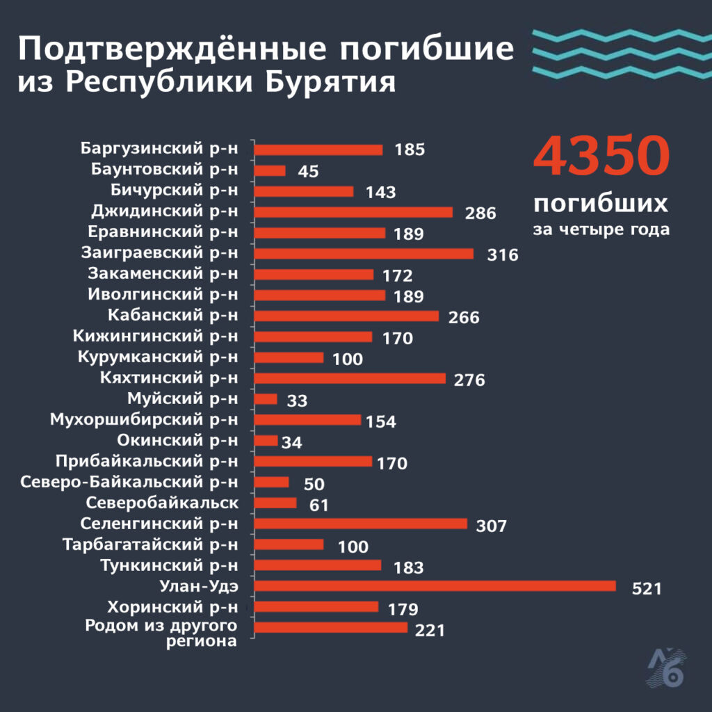 К концу четвертого года войны нам достоверно известно о 9200 погибших на фронте жителях двух регионов: 4350 из Бурятии и 4850 из Иркутской области. При этом мы полагаем, что реальная цифра всех потерь значительно выше.