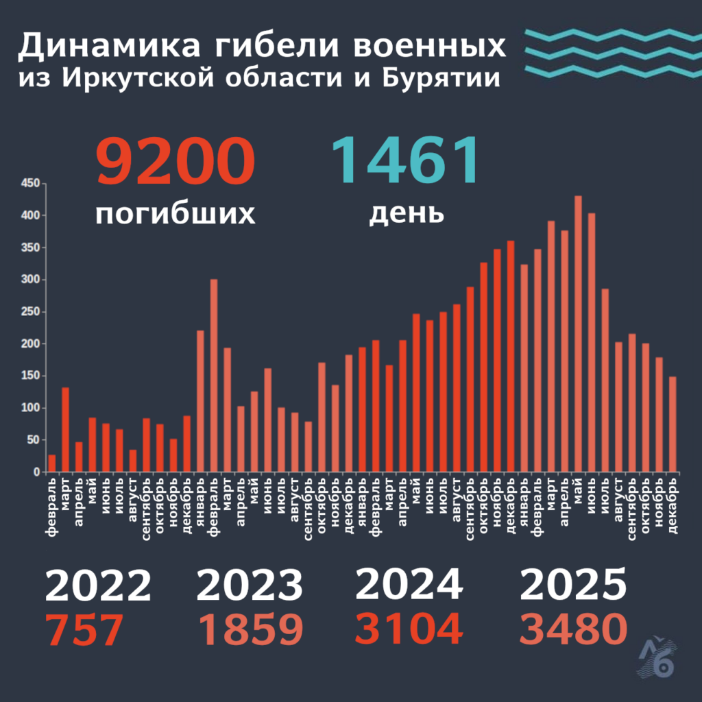 2022 год был наименее кровопролитным и унес жизни 757 военных из двух регионов. В 2023 году потери выросли в два с половиной раза и достигли 1859 человек за год. Пик смертей пришелся на начало года, когда погибло около 500 наших земляков — это совпало с наступлением российских войск на Бахмут. 2024 год стал еще более кровавым и унес жизни 3104 человек. На протяжении всего года ежемесячные потери увеличивались и продолжили расти в 2025 году. За последний год на войне погибло минимум 3480 жителей Прибайкалья, но опыт нашей работы показывает, что примерно о трети погибших мы еще не успели узнать, так что осторожно можно прогнозировать итоговую смертность за 2025 год в районе 5000 человек.