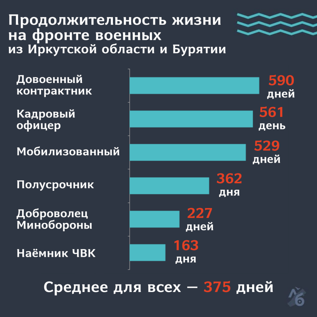 После отправки на фронт среднестатистический погибший из Прибайкалья прожил чуть больше года — 375 дней. Причем если профессиональный военный смог выжить в течение полутора лет, то доброволец — лишь семь месяцев. Наемники частных военных компаний обычно жили меньше полугода.