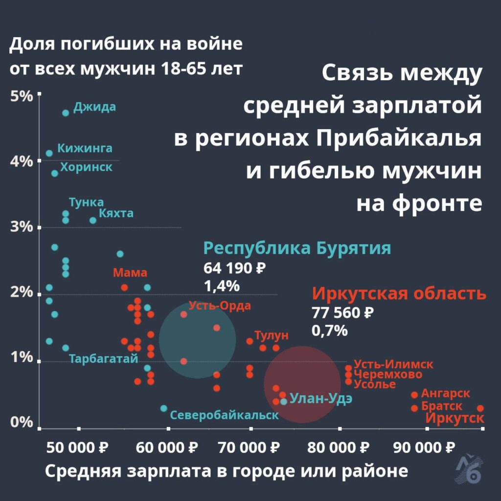 Наибольшая доля погибших, 4,7% от всех мужчин 18-65 лет, приходится на Джидинский район Бурятии — декларируемая средняя зарплата там также одна их самых низких в Прибайкалье, всего 48 150 рублей. Кроме того, во всех районах с зарплатой ниже 55 тысяч, на войне погибло больше 1% взрослых мужчин.